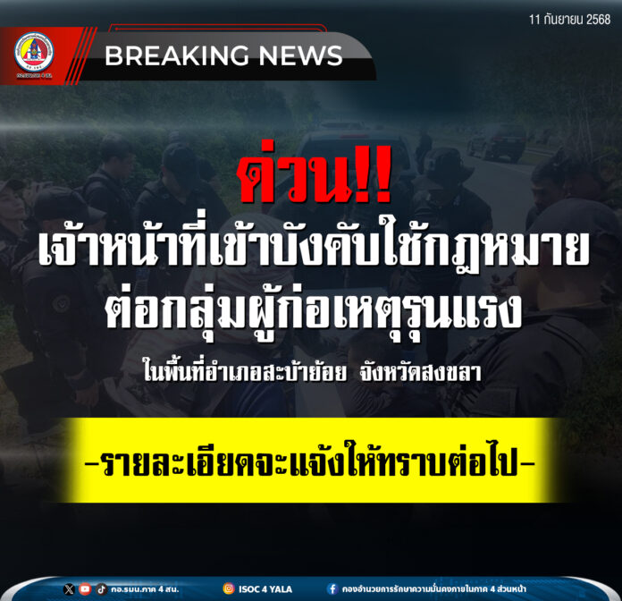 ประชาสัมพันธ์ข่าวชี้แจง กรณีเหตุการณ์ต่างๆ ด่วน เจ้าหน้าที่เข้าบังคับใช้กฎหมายต่อกลุ่มผู้ก่อเหตุรุนแรง ในพื้นที่อำเภอสะบ้าย้อย จังหวัดสงขลา รายละเอียดจะแจ้งให้ทราบต่อไป September 11, 2025 207 Share Facebook Twitter Google+ Telegram LINE ไม่เอาBRN ไม่เอาบีอาร์เอ็น ไม่เอาความรุนแรงชายแดนใต้ แม่ทัพภาคที่4 แม่ทัพไพศาล ศูนย์ประชาสัมพันธ์กองอำนวยการรักษาความมั่นคงภายในภาค4ส่วนหน้า