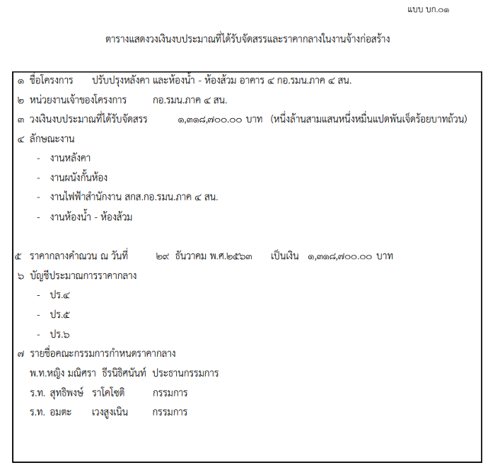 ตารางแสดงวงเงินงบประมาณที่ได้รับจัดสรรและราคากลางในจ้างก่อสร้าง โครงการ ปรับปรุงหลังคา และห้องน้ำ – ห้องส้วม อาคาร 4 กอ.รมน.ภาค 4 สน. (1,318,700.-)