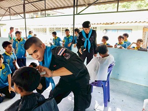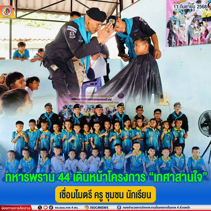 วันที่ 10 กันยายน 2568 หน่วยเฉพาะกิจกรมทหารพรานที่ 44 นำกำลังพลชุดปฏิบัติการเสริมสร้างความเข้าใจ ลงพื้นที่พบปะพูดคุยกับบุคลากรทางการศึกษา พร้อมจัดกิจกรรมบริการตัดผมให้นักเรียน ภายใต้โครงการ “เกศาสานใจ เพื่อพี่น้องประชาชน และเยาวชนในพื้นที่” เพื่อช่วยลดภาระค่าใช้จ่ายของผู้ปกครอง และยังทำให้นักเรียนมีทรงผมที่สะอาดเรียบร้อย เหมาะสมกับการเรียนรู้ อีกทั้งยังเป็นโอกาสในการสร้างสายสัมพันธ์อันดีระหว่างเจ้าหน้าที่รัฐกับครู นักเรียน และชุมชน