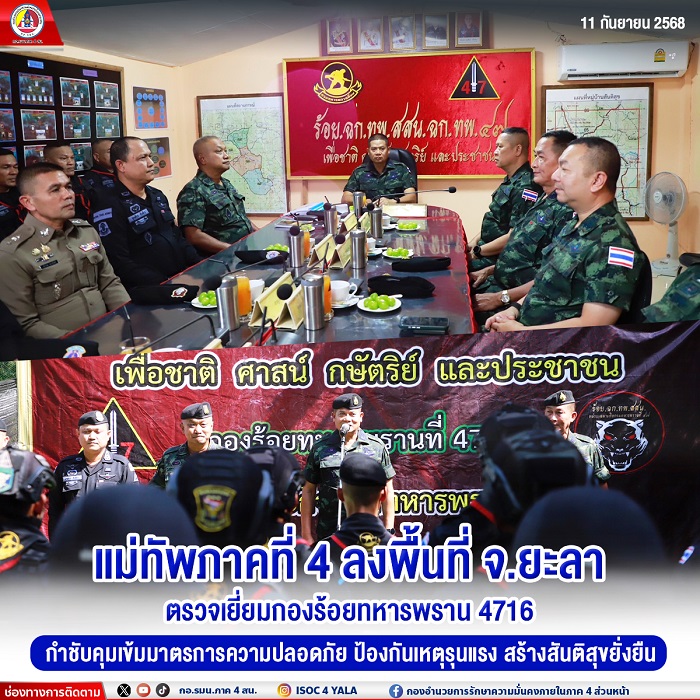 Hari ini (11 September 2025) jam 1.50 petang, di Kompeni Renjer 4716, Pasukan Khas Rejimen Renjer 47, di Kampung Patae, Daerah Yahya, Wilayah Yala – Lt. Jen. Paisan Nusang, Panglima Tentera Wilayah Ke-4 / Pengarah Keselamatan Dalam Negeri Wilayah 4, turun melawat, beri semangat dan sampaikan dasar operasi kepada anggota tentera. Tujuannya nak tingkatkan tahap keselamatan dan elak kejadian keganasan di kawasan bertanggungjawab.