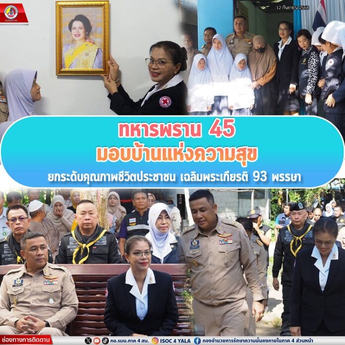 เมื่อวันที่ 11 กันยายน 2568 เวลา 07.40 น. ร้อยเอก สมพาร ปัญญา เสนาธิการหน่วยเฉพาะกิจกรมทหารพรานที่ 45 และผู้บังคับกองร้อยทหารพรานที่ 4515 พร้อมด้วยชุดปฏิบัติการกิจการพลเรือนของหน่วย ร่วมกับ นายวิมุตติ อำนักมณี นายอำเภอระแงะ, นายกองค์การบริหารส่วนตำบลเฉลิม, ผู้นำท้องที่, ผู้นำท้องถิ่น, ผู้นำศาสนา, บุคลากรทางการศึกษา ตลอดจนส่วนราชการและพี่น้องประชาชนในพื้นที่ ร่วมกิจกรรมมอบบ้านตามโครงการ “ซ่อมแซมและสร้างบ้านให้ผู้ยากไร้ด้อยโอกาส”