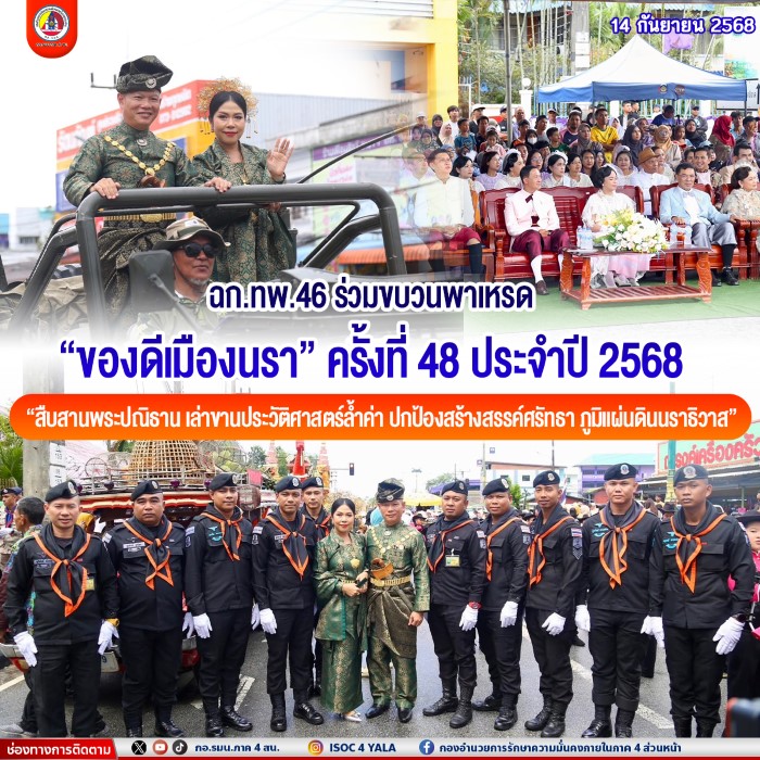 พันเอก สิทธิชัย บำรุงเขต ผู้บังคับหน่วยเฉพาะกิจกรมทหารพรานที่ 46 พร้อมด้วย คุณจริยา สราญจิตต์ ประธานสมาคมแม่บ้านทหารบก สาขากรมทหารพรานที่ 46 และกำลังพลของหน่วย ร่วมเดินขบวนพาเหรดในงาน “ของดีเมืองนรา” ครั้งที่ 48 ซึ่งจัดขึ้นระหว่างวันที่ 13 – 22 กันยายน 2568 ณ สวนสาธารณะเฉลิมพระเกียรติ 6 รอบ พระชนมพรรษา อำเภอเมือง จังหวัดนราธิวาส