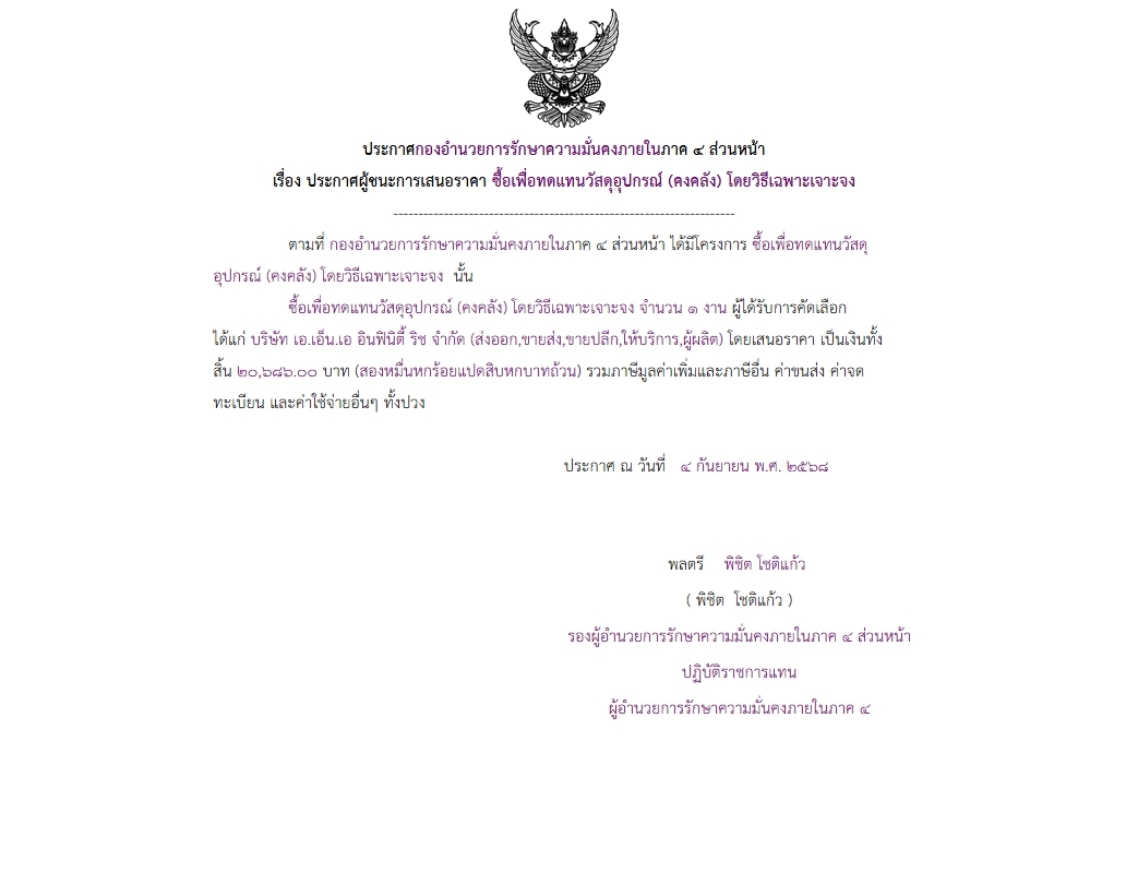 ประกาศผู้ชนะการเสนอราคา ซื้อเพื่อทดแทนวัสดุอุปกรณ์ (คงคลัง) โดยวิธีเฉพาะเจาะจง