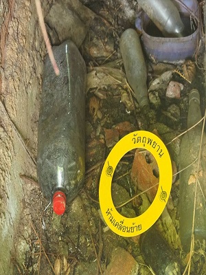 จากนั้นในวันที่ 7 กันยายน 2568 เวลา 10.00 น. หน่วยเฉพาะกิจกรมทหารพรานที่ 45 จึงได้จัดกำลังร่วมกับส่วนที่เกี่ยวข้องเขาทำการตรวจสอบบริเวณสวนปาล์มตรงข้ามบ้านของนายลูกมันฯ ณ บ้านกลูโฆ ตำบลบองอ อำเภอระแงะ จังหวัดนราธิวาส ตรวจพบอุปกรณ์เหล็กตัดสั้นคละขนาด บรรจุในขวดพลาสติก จำนวน 1 ขวด และขวดน้ำมันเบนซิน อีก 1 ขวด ศูนย์พิสูจน์หลักฐาน 10 นราธิวาส จึงได้นำวัตถุพยาน ไปตรวจพิสูจน์ต่อไป