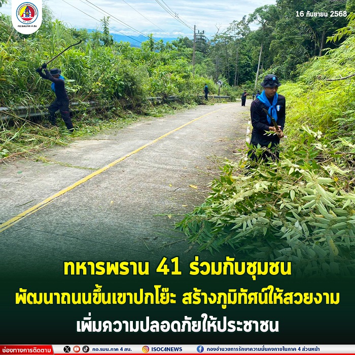 วันที่ 15 กันยายน 2568 เวลา 13.00 น. ที่บ้านตลาดนิคม หมู่ที่ 6 ตำบลตลิ่งชัน อำเภอบันนังสตา จังหวัดยะลา หน่วยเฉพาะกิจกรมทหารพรานที่ 41 โดยกำลังพลชุดปฏิบัติการกิจการพลเรือน กองร้อยทหารพรานที่ 4110 ร่วมกับผู้ใหญ่บ้าน ผู้ช่วยผู้ใหญ่บ้าน และประชาชนในพื้นที่ ได้ร่วมกันจัดกิจกรรมพัฒนาชุมชน ปรับปรุงภูมิทัศน์ ตัดหญ้าและเก็บกวาดสองข้างถนนทางขึ้นเขาปกโย๊ะ เพื่อให้เส้นทางสัญจรมีความเป็นระเบียบเรียบร้อยและสะอาดตา แต่ยังช่วยเปิดทัศนวิสัยให้ชัดเจนยิ่งขึ้น ลดความเสี่ยงในการเกิดอุบัติเหตุ สร้างความปลอดภัยให้กับประชาชนและนักท่องเที่ยวที่ใช้ถนนสายดังกล่าว ซึ่งเป็นเส้นทางสำคัญที่เชื่อมต่อระหว่างชุมชนและพื้นที่ป่าเขา