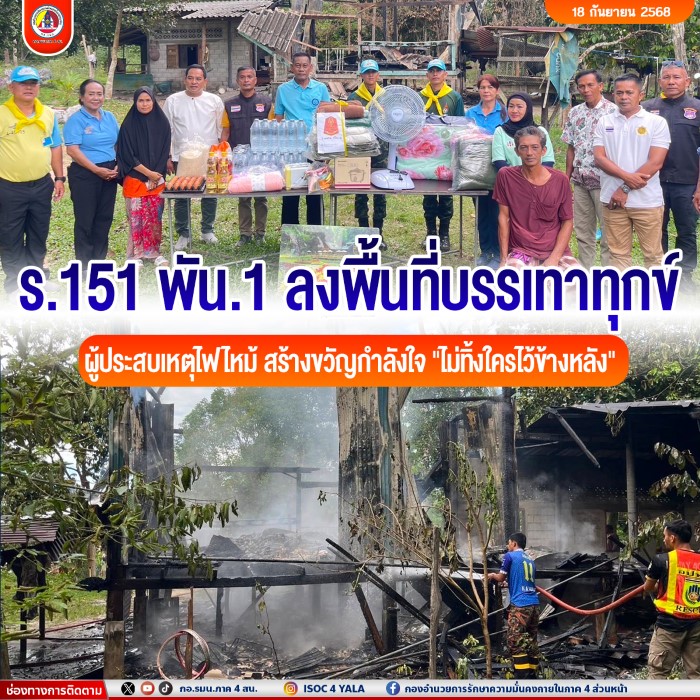 On 17 September 2025 at 14:00 hrs, the 1st Battalion, 151st Infantry Regiment (1/151 INF) deployed its Disaster Relief Team and Civil Affairs Team to provide assistance to a family affected by a house fire at House No. 112/2, Village No. 1, Ban Yabi, Kaluwor Subdistrict, Mueang Narathiwat District.