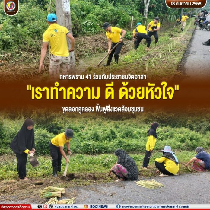 วันที่ 17 กันยายน 2568 เวลา 08.30 น. หน่วยเฉพาะกิจกรมทหารพรานที่ 41 โดย กองร้อยทหารพรานที่ 4111 ได้ร่วมกับผู้นำท้องที่ ผู้นำท้องถิ่น ชุดคุ้มครองตำบลบาโงย และประชาชนจิตอาสาในพื้นที่ จัดกิจกรรมจิตอาสา “เราทำความ ดี ด้วยหัวใจ” ณ บ้านปาโละ หมู่ที่ 3 ตำบลบาโงย อำเภอรามัน จังหวัดยะลา โดยร่วมกันขุดลอกคูคลอง กำจัดวัชพืช ขยะ และสิ่งปฏิกูลที่ขวางทางน้ำ เพื่อฟื้นฟูระบบระบายน้ำให้มีประสิทธิภาพมากขึ้น ลดความเสี่ยงจากปัญหาน้ำท่วมขังในพื้นที่ชุมชน โดยเฉพาะในช่วงฤดูฝนที่อาจเกิดน้ำหลากและส่งผลกระทบต่อความเป็นอยู่ของประชาชน