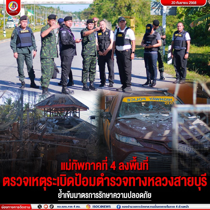 วันนี้ (20 กันยายน 2568) เวลา 08.30 น. พลโท ไพศาล หนูสังข์ แม่ทัพภาคที่ 4 / ผู้อำนวยการรักษาความมั่นคงภายในภาค 4 ลงพื้นที่ตรวจสอบเหตุการณ์ความรุนแรง หลังจากเมื่อกลางดึกวันที่ 19 กันยายน 2568 เวลา 23.55 น. เกิดเหตุระเบิดบริเวณหน้าป้อมตำรวจทางหลวงกลาพอ (ส.ทล.5 กก.7 บก.ทล.) บ้านเตราะบอน หมู่ที่ 1 ตำบลเตราะบอน อำเภอสายบุรี จังหวัดปัตตานี