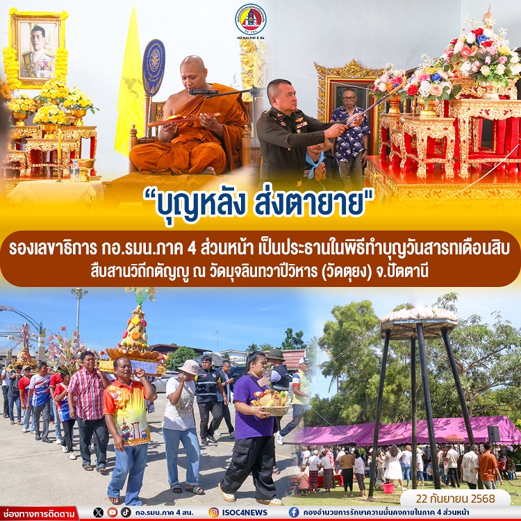 The Deputy Secretary-General of the Internal Security Operations Command Region 4 Front (ISOC Region 4 Front) presided over the Sart Duen Sib (Tenth Lunar Month Festival) merit-making ceremony at Wat Mujjalintawapi Wihan (Wat Tuyong) in Pattani Province, continuing the tradition of filial piety and remembrance of ancestors.