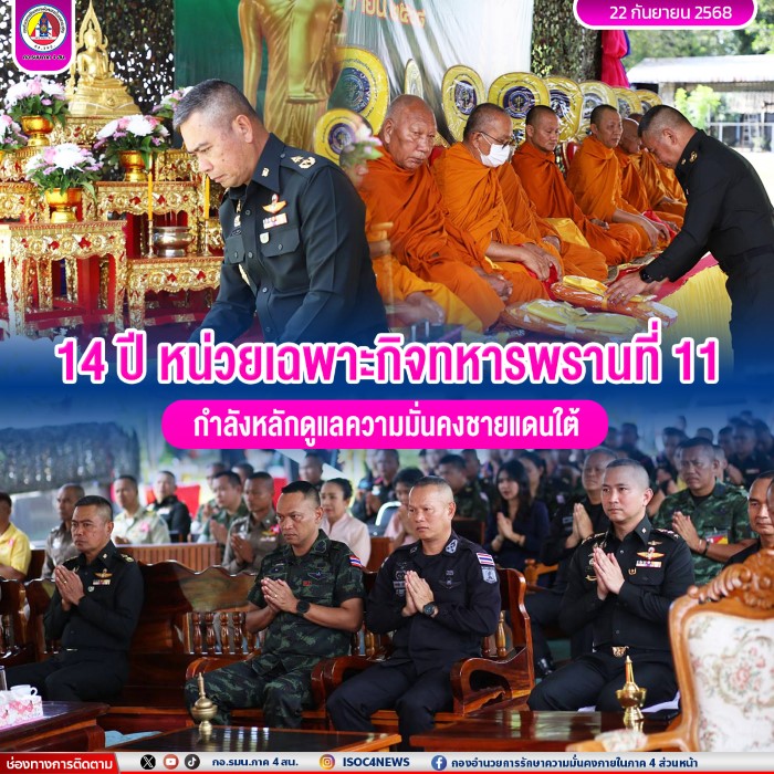 Today, September 23, 2025, at 10:00 AM, a ceremony was held at the headquarters of the 11th Ranger Task Force in Lo Chut Subdistrict, Waeng District, Narathiwat Province, to commemorate its 14th anniversary. The ceremony was presided over by Major General Setthawut Jantana, Secretary-General of the Internal Security Operations Command (ISOC) Region 4 Forward Command, and attended by senior commanders and military personnel.