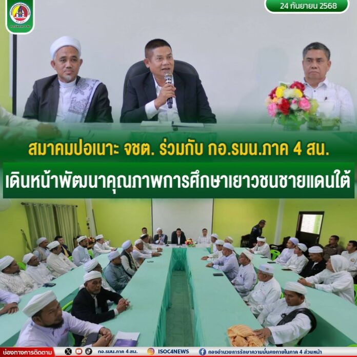 Today, September 24, 2025, at 2:30 p.m., at Islam Pattana Panya School in Saiburi District, Pattani Province, Lieutenant General Paisan Nusang, Commander of the 4th Army Region and Director of the Internal Security Operations Command (ISOC) Region 4, met with school administrators, religious leaders, and personnel from Islamic pondok institutions. The meeting was led by Mr. Muhammad Suwree Saleh, President of the Southern Border Provinces Islamic Pondok Association, representing institutions across the five southernmost provinces. The aim was to discuss strategic policy directions for enhancing the educational development of pondok schools in the region.