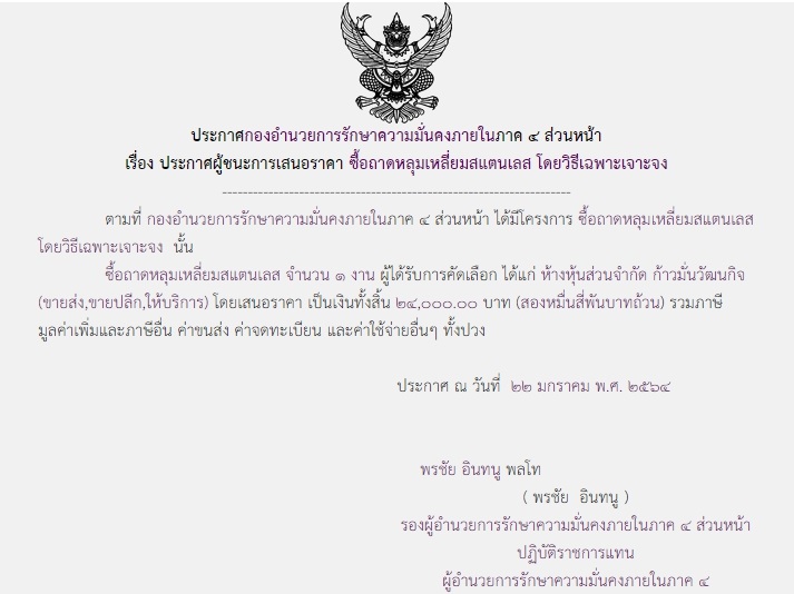 ประกาศผู้ชนะการเสนอราคา ซื้อถาดหลุมเหลี่ยมสแตนเลส โดยวิธีเฉพาะเจาะจง ( 24,000.00 บาท )