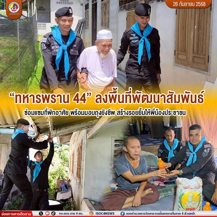 เมื่อวันที่ 25 กันยายน 2568 ชุดปฏิบัติการกิจการพลเรือน หน่วยเฉพาะกิจกรมทหารพรานที่ 44 ลงพื้นที่พบปะพูดคุยกับพี่น้องประชาชนทั้งชาวไทยพุทธและชาวไทยมุสลิมกลุ่มเปราะบางในพื้นที่ เพื่อสร้างความสัมพันธ์อันดีและเสริมสร้างความมั่นคงของชุมชน โดยได้ร่วมกันปรับปรุงซ่อมแซมที่พักอาศัยของ นางอารี (สงวนนามสกุล) ประชาชนในพื้นที่ เพื่อให้มีความมั่นคงแข็งแรงและยกระดับคุณภาพชีวิตให้ดีขึ้น พร้อมทั้งเข้าพบปะเยี่ยมเยียนประชาชน สอบถามความเป็นอยู่ และรับฟังปัญหาความต้องการที่ควรได้รับการช่วยเหลือจากทางภาครัฐ