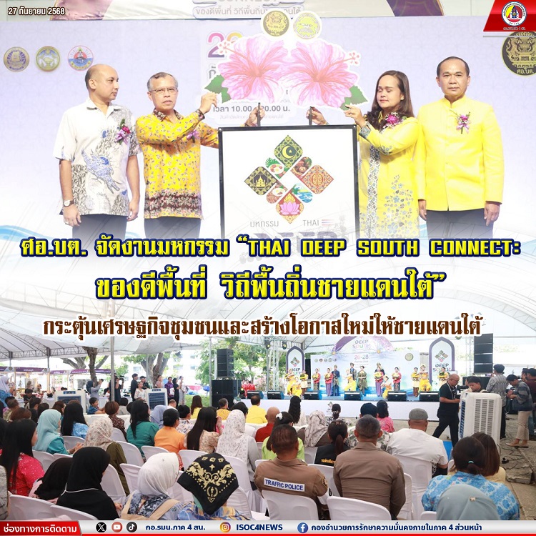 เมื่อวันที่ 26 กันยายน 2568 ที่ บริเวณลานหน้าออมทอง โรงแรม ซี.เอส. ปัตตานี อำเภอเมือง จังหวัดปัตตานี เต็มไปด้วยบรรยากาศที่คึกคักและอบอวลด้วยรอยยิ้มของพ่อค้าแม่ค้า ผู้ประกอบการชุมชน และประชาชนทั่วไปที่มาร่วมงาน มหกรรม “THAI DEEP SOUTH CONNECT: ของดีพื้นที่ วิถีพื้นถิ่นชายแดนใต้” ซึ่งจัดขึ้นอย่างยิ่งใหญ่ เพื่อเปิดพื้นที่โชว์ของดีประจำถิ่น และสร้างโอกาสทางเศรษฐกิจให้แก่ชุมชนในพื้นที่ชายแดนใต้ พิธีเปิดได้รับเกียรติจาก ท่านนันทพงศ์ สุวรรณรัตน์ รองเลขาธิการศูนย์อำนวยการบริหารจังหวัดชายแดนภาคใต้ เป็นประธานเปิดงาน โดยมี นาวาเอก จักรพงษ์ อภิมหาธรรม ผู้อำนวยการกองส่งเสริมและสนับสนุนงานพัฒนาฝ่ายพลเรือน หัวหน้าส่วนราชการ และเจ้าหน้าที่ที่เกี่ยวข้อง รวมถึงประชาชนในพื้นที่ ร่วมพิธีเปิดในครั้งนี้อย่างคับคั่ง
