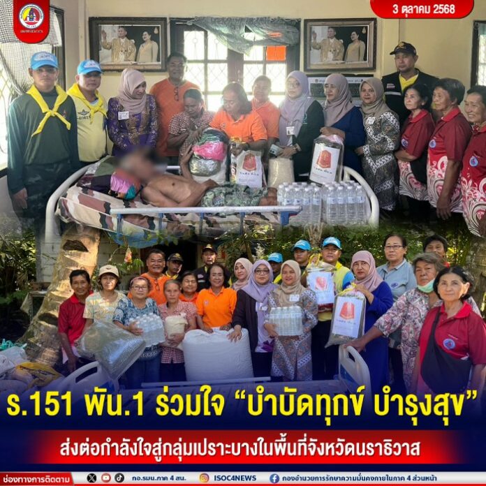 เมื่อวันที่ 2 ตุลาคม 2568 เวลา 15.00 น. กองพันทหารราบที่ 1 กรมทหารราบที่ 151 พร้อมด้วย ชุดปฏิบัติการกิจการพลเรือน จิตอาสาพระราชทาน, รองประธานโฆษกชาวบ้านจังหวัดนราธิวาส, จิตอาสาศูนย์ประสานการแพทย์จังหวัดชายแดนภาคใต้, ประธานกลุ่มวิสาหกิจชุมชนประชาภิรมย์, ผู้นำชุมชนหมู่ที่ 7 และหมู่ที่ 9 ตลอดจน อาสาสมัครสาธารณสุขประจำหมู่บ้าน ร่วมลงพื้นที่ไปยังบ้านเลขที่ 155/4 หมู่ที่ 7 ตำบลโคกเคียน อำเภอเมือง จังหวัดนราธิวาส เพื่อเยี่ยมและให้ความช่วยเหลือ นายสมบุรณ์ จินดาธรรม ผู้ป่วยติดเตียงซึ่งอยู่ในความดูแลของบุตร พร้อมให้กำลังใจ