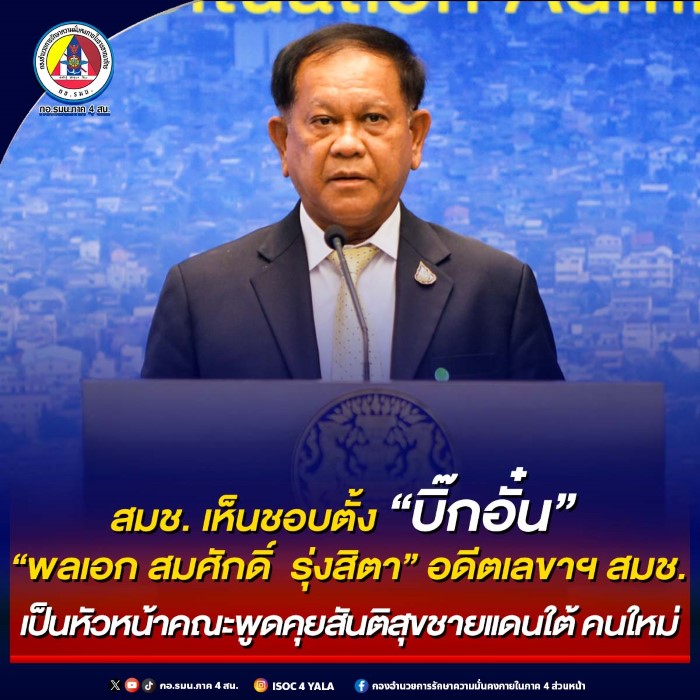On October 2, 2025, the National Security Council (NSC) approved the appointment of General Somsak Roongsita, former Secretary-General of the NSC, as the new Chief of the Peace Dialogue Panel for Thailand’s Southern Border Provinces. This appointment is intended to advance the ongoing peace-building process in the region. It marks a significant step by the government in addressing violence in the southern border provinces through peaceful means, with an emphasis on dialogue, negotiation, and inclusive participation from all sectors of society — including the government, civil society, and relevant stakeholder groups.