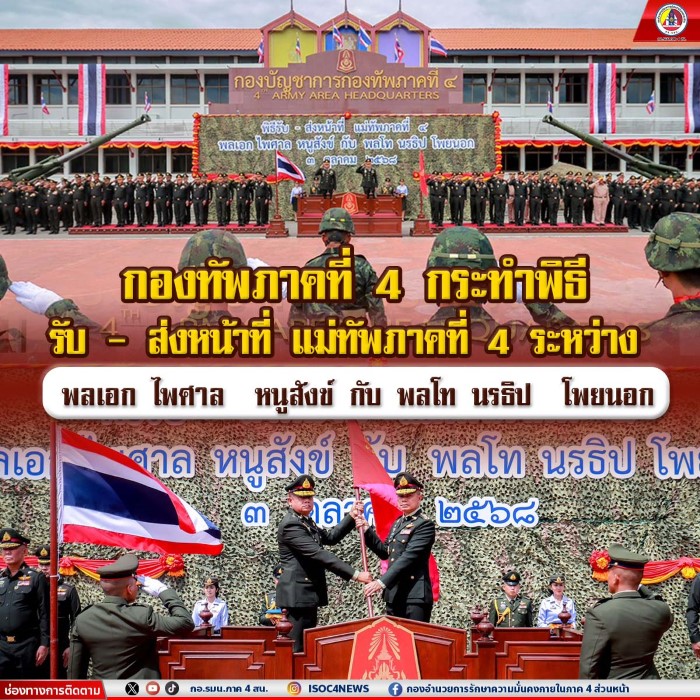 On October 3, 2025, at the Headquarters of the 4th Army Region, Wachirawut Camp, Pak Phun Subdistrict, Mueang District, Nakhon Si Thammarat Province, a formal ceremony was held to mark the handover of duties and command of the 4th Army Region from General Paisan Nusang to Lieutenant General Norathip Poinok, the newly appointed commander. General Paisan Nusang has been graciously appointed to a higher position as Special Advisor to the Royal Thai Army.