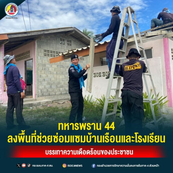เมื่อวันที่ 4 ตุลาคม 2568 หน่วยเฉพาะกิจกรมทหารพรานที่ 44 โดยกองร้อยทหารพรานที่ 4409 นำกำลังพลชุดปฏิบัติการกิจการพลเรือน และชุดช่าง ดำเนินการซ่อมแซมหลังคาห้องน้ำของโรงเรียนตาดีกาอัตเตาบะห์ หมู่ 2 บ้านบน ตำบลปะเสยะวอ อำเภอสายบุรี จังหวัดปัตตานี ซึ่งได้รับความเสียหายจากอิทธิพลของพายุลมแรงในพื้นที่ ทำให้หลังคาห้องน้ำของโรงเรียนชำรุด กระเบื้องหลุดออกจำนวนมาก ส่งผลกระทบต่อการใช้งานของนักเรียนในชีวิตประจำวัน เจ้าหน้าที่ทหารพรานจึงเร่งเข้าช่วยเหลือ ซ่อมแซมเปลี่ยนหลังคาใหม่เพื่อให้กลับมาใช้งานได้อย่างปลอดภัยและถูกสุขลักษณะ