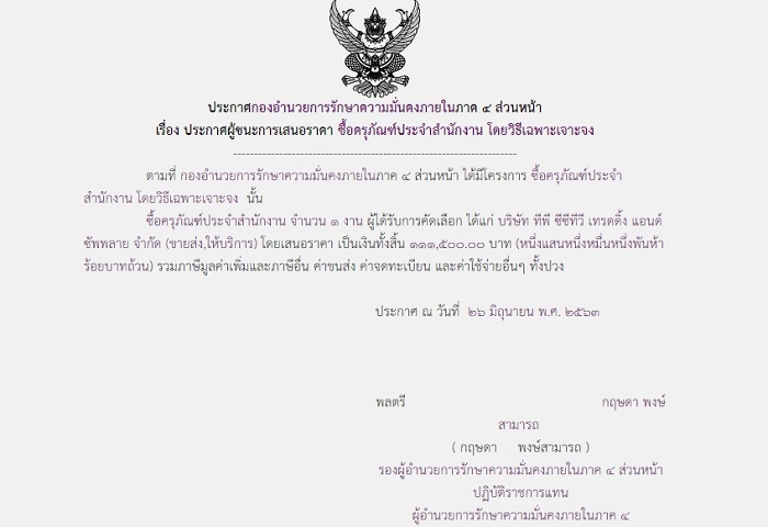 ประกาศผู้ชนะการเสนอราคา ซื้อครุภัณฑ์ประจำสำนักงาน โดยวิธีเฉพาะเจาะจง(๑)