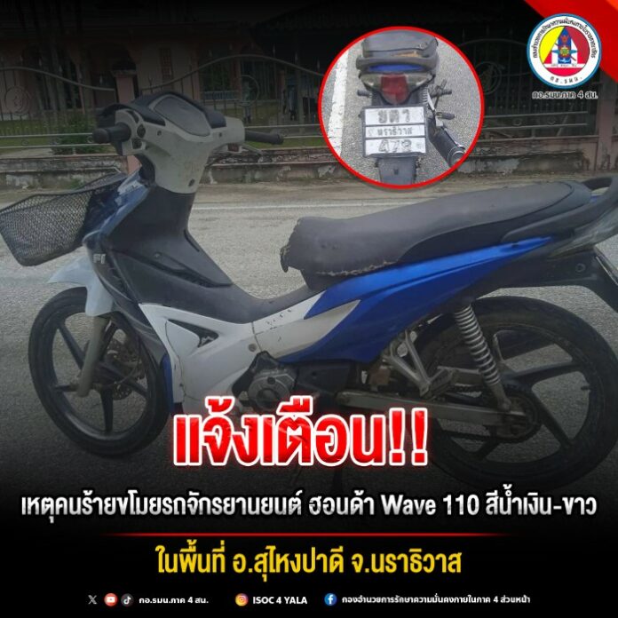 On 7 October 2025 at 11:15 a.m., the Commander of Ranger Company 4801 received a report from the village head of Ban Ponoh, Village No. 7, that a Honda Wave 110 motorcycle, blue-white in color, license plate ขตว 478 Narathiwat, was stolen from House No. 371/3, Ban Ponoh, Village No. 7, Puluru Subdistrict, Sungai Padi District, Narathiwat Province.