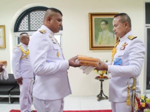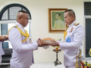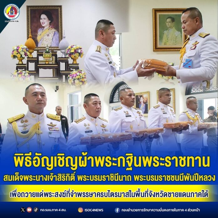 On 7 October 2025 at 13:15 hrs, at the Royal Ceremonial Division, Bureau of the Royal Household, Wat Phra Si Rattana Satsadaram (Wat Phra Kaew), Na Phra Lan Road, Phra Nakhon District, Bangkok — Lieutenant General Norathip Phoeynok, Commander of the 4th Army Region / Director of Internal Security Operations Command Region 4, presided over the ceremony to receive four sets of the Royal Kathina Robes graciously bestowed by Her Majesty Queen Sirikit, The Queen Mother, and entrusted to the Coordination Center for Royal Initiative Projects to be respectfully offered to monks who have completed their annual rains retreat at temples in the southern border provinces and four districts of Songkhla Province.