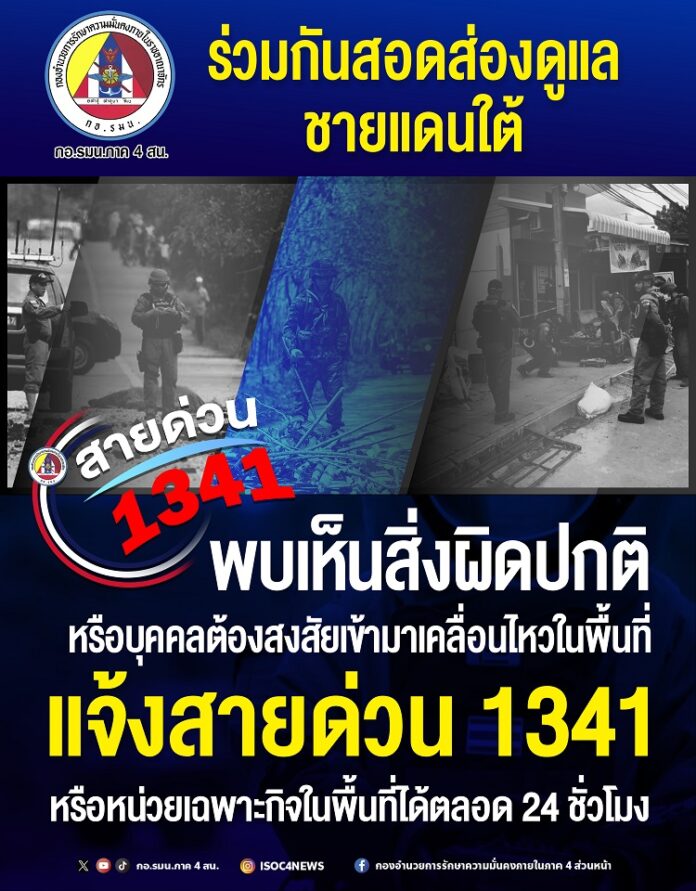 ประชาสัมพันธ์ข่าวประชาสัมพันธ์ ร่วมกันสอดส่องดูแลพื้นที่ชายแดนใต้ พบเห็นสิ่งผิดปกติหรือบุคคลต้องสงสัยเข้ามาเคลื่อนไหวในพื้นที่ แจ้งสายด่วน กอ.รมน.ภาค 4 สน. โทร. 1341 หรือแจ้งหน่วยเฉพาะกิจในพื้นที่ใกล้บ้านได้ตลอด 24 ชั่วโมง “ร่วมมือ ร่วมใจ สร้างความปลอดภัยให้ชุมชน” October 8, 2025 105 Share Facebook Twitter Google+ Telegram LINE แม่ทัพภาคที่4 ศูนย์ประชาสัมพันธ์กองอำนวยการรักษาความมั่นคงภายในภาค4ส่วนหน้า