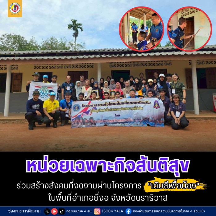 The Santisuk Special Task Force, led by Unit 401, in collaboration with Taksin Relations Unit 441, the Marine Ranger Special Task Force, members of the Village Protection Volunteer Unit in Lahan Subdistrict, and civil society networks including Saijai Thai Su Jai Tai, Thai Pen Nueng, TO BE NUMBER ONE, and the DSC Group, jointly organized a community development activity under the project “Adding Colors for Children” at Darul Nashri Mosque, Bue Nae Kuroh Village (a branch of Putar Village), Moo 3, Lahan Subdistrict, Yi-ngo District, Narathiwat Province.