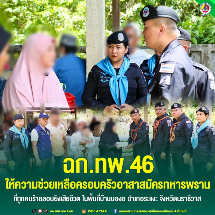 พันเอก สิทธิชัย บำรุงเขต ผู้บังคับหน่วยเฉพาะกิจกรมทหารพรานที่ 46 มอบหมายให้พันตรี วัชระ ปราบกรี ผู้บังคับกองร้อยทหารพรานกองหนุนฯ เป็นผู้แทนหน่วย พร้อมด้วยกำลังพล ลงพื้นที่ให้ความช่วยเหลือครอบครัวอาสาสมัครทหารพรานที่ถูกคนร้ายลอบยิงเสียชีวิต บ้านบองอ หมู่ที่ 4 ตำบลบองอ อำเภอระแงะ จังหวัดนราธิวาส พร้อมจัดกำลังพลชุดปฏิบัติการกิจการพลเรือนหญิง เข้าพบปะชี้แจงสร้างความเข้าใจให้ประชาชนกับเหตุการณ์ที่เกิดขึ้น รวมถึงได้มอบเงินช่วยเหลือเยียวยาพร้อมข้าวสาร ณ กูโบร์บ้านโต๊ะเปาะฆะ หมู่ที่ 10 ตำบลตันหยงมัส อำเภอระแงะ จังหวัดนราธิวาส