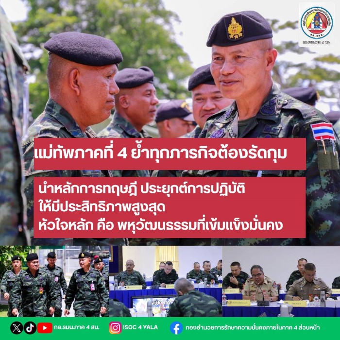 วันนี้ ( 13 ตุลาคม 2568 ) เวลา 11: 00 น. ที่ หน่วยเฉพาะกิจยะลา ตำบลเขาตูม อำเภอยะรัง จังหวัดปัตตานี พลโท นรธิป โพยนอก แม่ทัพภาคที่ 4/ ผู้อำนวยการรักษาความมั่นคงภายในภาค 4 พร้อมผู้บังคับบัญชา และผู้แทนสำนักอำนวยการกองอำนวยการรักษาความมั่นคงภายในภาค 4 ส่วนหน้า ลงพื้นที่ติดตามการขับเคลื่อนงานแก้ไขปัญหา รับทราบข้อขัดข้อง ตลอดจนการนำข้อผิดพลาดมาปรับปรุงแก้ไข ให้เกิดรูปธรรมมากยิ่งขึ้น