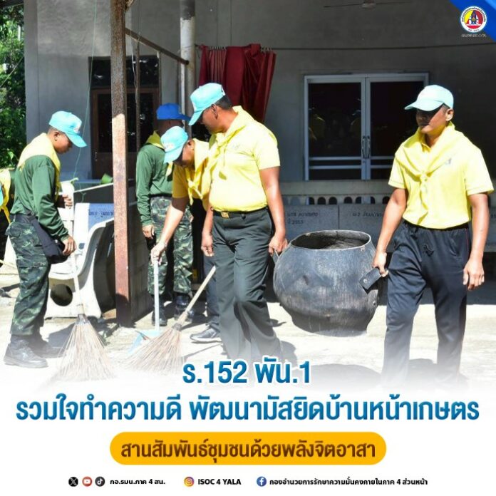 วันที่ 15 ตุลาคม 2568 เวลา 09.00 น. ณ มัสยิดบ้านหน้าเกษตร หมู่ที่ 2 ตำบลธารโต อำเภอธารโต จังหวัดยะลา พันโท อิสระพงศ์ บุญมา ผู้บังคับกองพันทหารราบที่ 1 กรมทหารราบที่ 152 นำกำลังพลพร้อมด้วย ร้อยโทจิรันธนิน พูลสวัสดิ์ นายทหารฝ่ายกิจการพลเรือน และชุดปฏิบัติการกิจการพลเรือนของหน่วย ร่วมกับ ชุดคุ้มครองตำบลธารโต, กำนัน, ผู้ใหญ่บ้าน และคณะกรรมการประจำมัสยิดบ้านหน้าเกษตร จัดกิจกรรม “จิตอาสาพัฒนาบำเพ็ญประโยชน์ ทำความดีด้วยหัวใจ”
