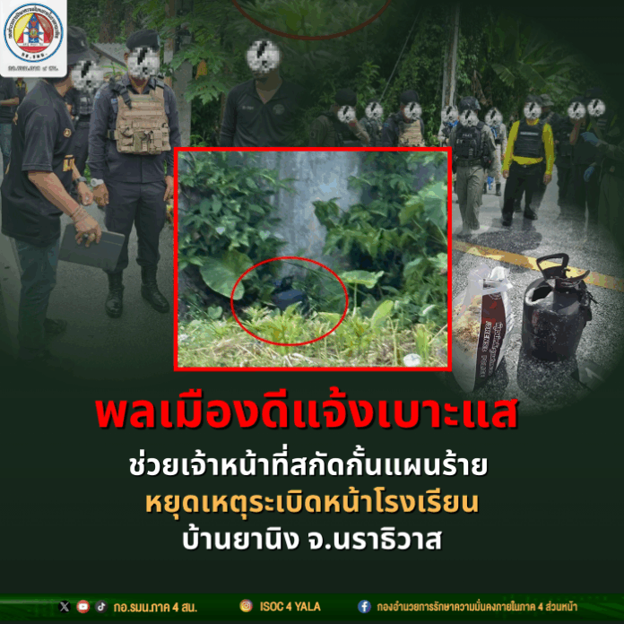 เมื่อวันที่ 15 ตุลาคม 2568 เวลา 18.10 น. เจ้าหน้าที่ได้รับแจ้งจากประชาชนในพื้นที่ถึงวัตถุต้องสงสัยคล้ายถังน้ำยาแอร์ วางอยู่บริเวณรั้วโรงเรียนบ้านยานิง หมู่ที่ 2 ตำบลจวบ อำเภอเจาะไอร้อง จังหวัดนราธิวาส จึงเร่งเข้าตรวจสอบและปิดกั้นพื้นที่อย่างเร่งด่วน เพื่อป้องกันอันตรายที่อาจเกิดขึ้นกับพี่น้องประชาชน