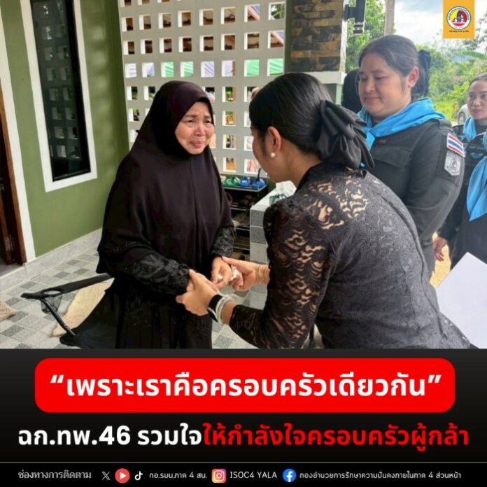 วันที่ 17 ตุลาคม 2568 เวลา 14.00 น. พันเอก สิทธิชัย บำรุงเขต ผู้บังคับหน่วยเฉพาะกิจกรมทหารพรานที่ 46 พร้อมด้วย คุณจริยา สราญจิตต์ ประธานสมาคมแม่บ้านทหารบก สาขากรมทหารพรานที่ 46 ให้การต้อนรับ พันเอก หาญพล เพชรม่วง ผู้บังคับบัญชากองกำลังทหารพรานจังหวัดชายแดนภาคใต้ และคณะ เนื่องในโอกาสลงพื้นที่ร่วมพิธีทำบุญทางศาสนาให้กับ อาสาสมัครทหารพราน นาซือรี แวสะมะแอ สังกัดกรมทหารพรานที่ 46 ซึ่งเสียชีวิตจากเหตุคนร้ายลอบยิงในพื้นที่บ้านยากาบองอ หมู่ที่ 4 ตำบลบองอ อำเภอระแงะ จังหวัดนราธิวาส