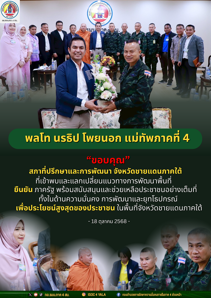จังหวัดชายแดนภาคใต้ เข้าพบ แม่ทัพภาคที่ 4 ร่วมหารือแนวทางขับเคลื่อนการพัฒนาพื้นที่ชายแดนใต้ ให้เกิดความมั่นคงและสันติสุขยั่งยืน