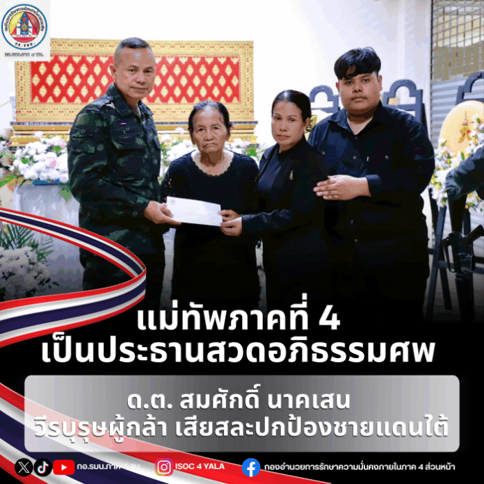 วันที่ 18 ตุลาคม 2568 เวลา 17.30 น. ณ ฌาปนสถานเทศบาลนครยะลา ตำบลสะเตง อำเภอเมือง จังหวัดยะลา พลโท นรธิป โพยนอก แม่ทัพภาคที่ 4/ผู้อำนวยการรักษาความมั่นคงภายในภาค 4 เป็นประธานในพิธีสวดอภิธรรมศพ ดาบตำรวจ สมศักดิ์ นาคเสน ผู้บังคับหมู่ กองกำกับการตำรวจตระเวนชายแดนที่ 44 /เจ้าหน้าที่หน่วยเก็บกู้และทำลายวัตถุระเบิด (EOD) ซึ่งเสียชีวิตจากเหตุเจ้าหน้าที่ฝ่ายความมั่นคงเข้าบังคับใช้กฎหมาย เพื่อติดตามกลุ่มผู้ก่อเหตุรุนแรง ในพื้นที่ ม.4 ต.บางเก่า อ.สายบุรี บริเวณใกล้กับสถานศึกษาปอเนาะ เมื่อวันที่ 15 ตุลาคม 2568 ที่ผ่านมา โดยขณะที่ ดาบตำรวจ สมศักดิ์ นาคเสน กำลังปฏิบัติหน้าที่นำเด็กนักเรียนปอเนาะ ออกจากที่พักไปรวมตัวกันที่มัสยิด เพื่อความปลอดภัย แต่กลับถูกคนร้ายที่ซ่อนตัวอยู่ลอบยิง ทำให้ ดาบตำรวจ สมศักดิ์ นาคเสน ผู้บังคับหมู่กองกำกับการตำรวจตระเวนชายแดนที่ 44/เจ้าหน้าที่หน่วยเก็บกู้และทำลายวัตถุระเบิด (EOD) ได้รับบาดเจ็บสาหัส และเสียชีวิตในเวลาต่อมา