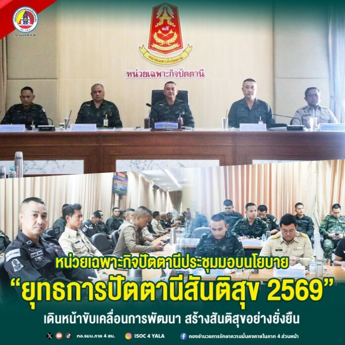 พลตรี ณรงค์ ตันติสิทธิพร ผู้บังคับหน่วยเฉพาะกิจปัตตานี เป็นประธานการประชุมมอบนโยบาย “ยุทธการปัตตานีสันติสุข ประจำปี 2569” เพื่อกำหนดทิศทางการปฏิบัติงานในปีงบประมาณใหม่อย่างเป็นระบบ โดยมุ่งเน้นการเสริมสร้างเสถียรภาพด้านความมั่นคง ควบคู่กับการพัฒนาคุณภาพชีวิตของประชาชนในทุกมิติ ทั้งด้านเศรษฐกิจ สังคม การศึกษา และโครงสร้างพื้นฐานในพื้นที่จังหวัดชายแดนภาคใต้