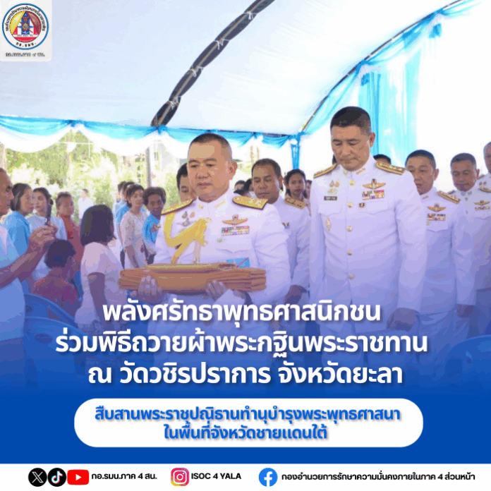 วันนี้ (19 ตุลาคม 2568) เวลา 13.00 น. ณ วัดวชิรปราการ อำเภอรามัน จังหวัดยะลา พลโท นรธิป โพยนอก แม่ทัพภาคที่ 4 /ผู้อำนวยการรักษาความมั่นคงภายในภาค 4 เป็นประธานฝ่ายฆราวาสในพิธีถวายผ้าพระกฐินพระราชทาน โดยมอบหมายให้ พลตรี ณรงค์ ตันติสิทธิพร ผู้บัญชาการกองพลทหารราบที่ 15 / ผู้อำนวยการศูนย์ประสานงานโครงการอันเนื่องมาจากพระราชดำริ เป็นผู้แทนถวายผ้าพระกฐินพระราชทาน แด่พระสงฆ์