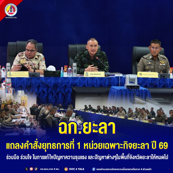 วันที่ 20 ตุลาคม 2568 เวลา 10.00 น. ณ ห้องประชุมหน่วยเฉพาะกิจยะลา พลตรี อภินันท์ แจ่มแจ้ง ผู้บังคับหน่วยเฉพาะกิจยะลาเป็นประธานการประชุมมอบนโยบาย และแถลงคำสั่งยุทธการที่ 1 หน่วยเฉพาะกิจยะลา ประจำปี 2569 เพื่อกำหนดทิศทางการปฏิบัติงานแก่หน่วยในพื้นที่รับผิดชอบโดยร่วมกันขับเคลื่อนงานตามแผนเสริมสร้างสันติสุขจังหวัดชายแดนภาคใต้ ปี2569 ของกองอำนวยการรักษาความมั่นคงภายใน ภาค 4 ส่วนหน้าให้เป็นไปในทิศทางเดียวกันในทุกมิติ ทั้งมิติด้านความมั่นคง และมิติด้านการพัฒนาคุณภาพชีวิต โดยมีคณะผู้บังหน่วยในพื้นที่ ทั้งหน่วยทหาร ตำรวจ ฝ่ายปกครอง และส่วนที่เกี่ยวข้องเข้าร่วมประชุม