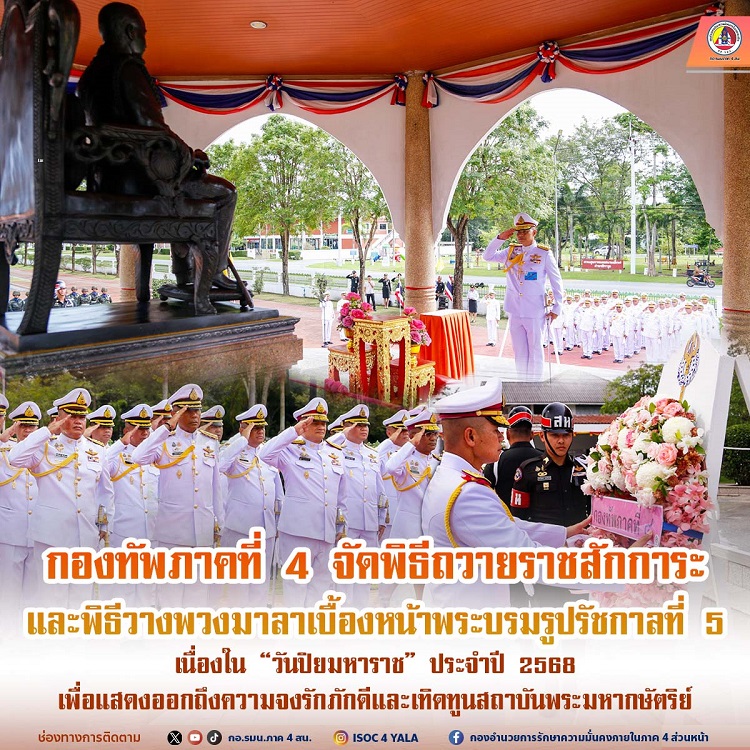 Hari ini (22 Oktober 2568), jam 09.09 pagi di Dataran Tugu Raja Chulalongkorn (Rama Ke-5), Kem Wachirawut, Markas Pemerintahan Tentera Wilayah Ke-4, Daerah Mueang, Wilayah Nakhon Si Thammarat – Tentera Wilayah Ke-4 telah mengadakan majlis hormat diraja dan letak kalungan bunga sempena memperingati Hari Piyamaharaj, iaitu hari mangkatnya Raja Chulalongkorn (Rama Ke-5), untuk tunjukkan kesetiaan dan penghormatan kepada institusi diraja.