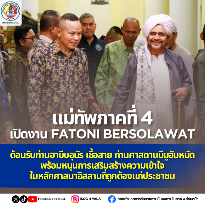 วันที่ (22 ตุลาคม 2568) เวลา 20.30 น. ที่ สนามกีฬาออมทอง อำเภอเมืองปัตตานี จังหวัดปัตตานี พลโท นรธิป โพยนอก แม่ทัพภาคที่ 4 / ผู้อำนวยการรักษาความมั่นคงภายในภาค 4 เป็นประธานเปิดงาน “FATONI BERSOLAWAT” และกล่าวต้อนรับ ท่านฮาบีบอุมัร มูฮัมหมัด ซาเล็ม บินฮาฟิส เชื้อสายท่านศาสดานบีมูฮัมหมัด ศาสดาแห่งศาสนาอิสลาม ลำดับที่ 33 ของโลกอิสลาม ผู้นำจิตวิญญาณมุสลิม อันดับ 1 ของโลกอิสลาม และเป็นผู้ทรงอิทธิพลของโลกอิสลาม ในด้านจิตวิญญาณและความศรัทธา พร้อมด้วยผู้นำศาสนาจากประเทศมาเลเซีย อินโดนีเซีย บรูไน สิงคโปร์ ท่านจุฬาราชมนตรี แห่งอาเจะห์ ประเทศอินโดนีเซีย และคณะผู้นำศาสนาจากอาเซียน โดยมี พลตรี กรกฎ ภู่โชติ รองผู้อำนวยการรักษาความมั่นคงภายในภาค 4 ส่วนหน้า , หัวหน้าส่วนราชการ , ผู้นำศาสนา , มุสลิมมะห์ และเยาวชนในพื้นที่ ร่วมให้การต้อนรับและเข้าร่วมงานกว่า 5,000 คน