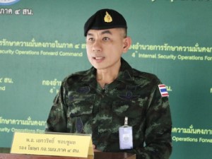 พันเอก เอกวริทธิ์ ชอบชูผล รองโฆษกกองอำนวยการรักษาความมั่นคงภายในภาค 4 ส่วนหน้า / หัวหน้าศูนย์ประชาสัมพันธ์ กองอำนวยการรักษาความมั่นคงภายในภาค 4 ส่วนหน้า ชี้แจงความคืบหน้ากรณีบริษัทขนส่งเอกชน ตรวจพบลูกกระสุนปืนขนาด 40 มิลลิเมตร ขณะคัดแยกพัสดุ ที่อำเภอบางกล่ำ จังหวัดสงขลา