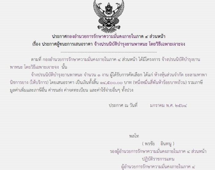ประกาศผู้ชนะการเสนอราคา จ้างปรนนิบัติบำรุงยานพาหนะ โดยวิธีเฉพาะเจาะจง ( 14,500.00 บาท )
