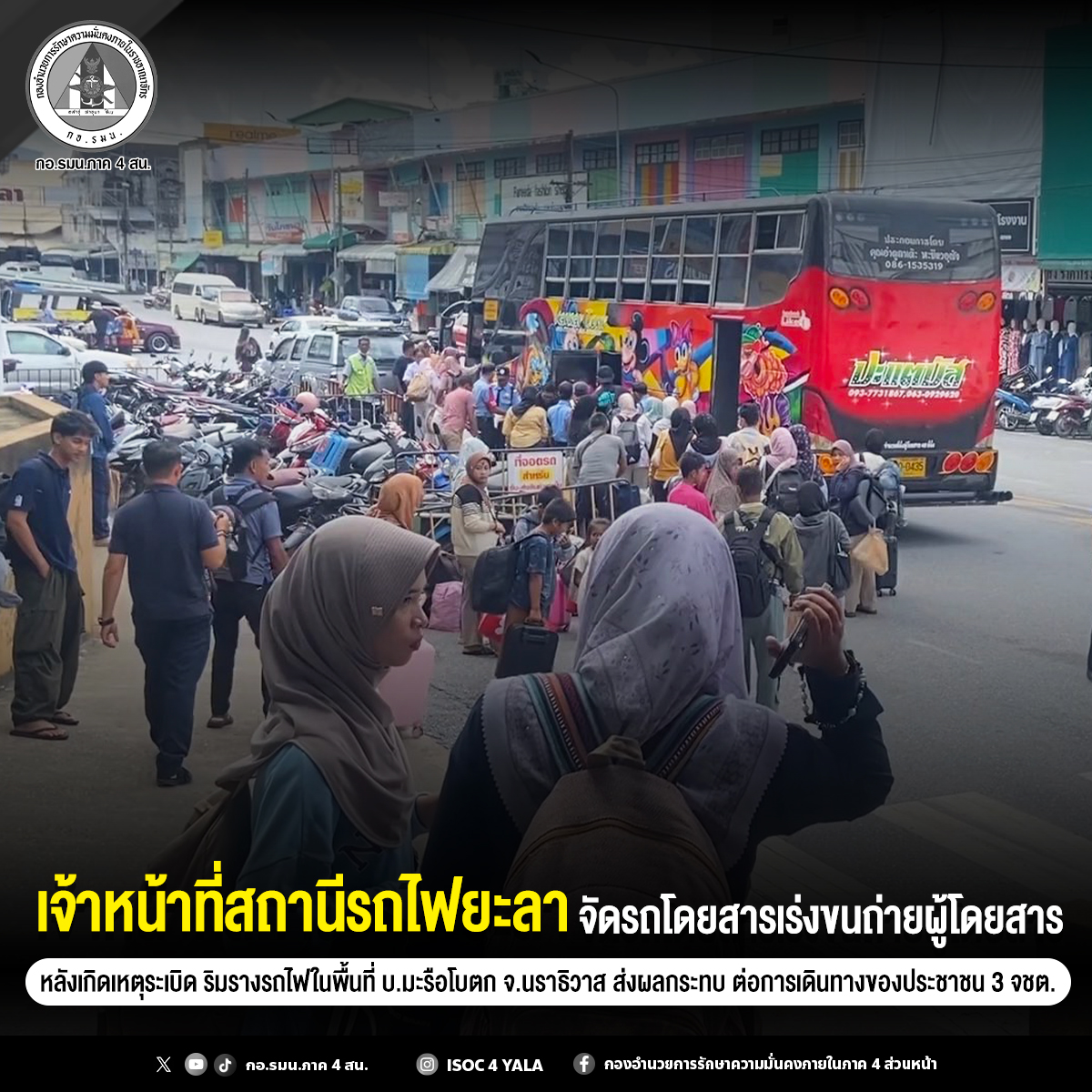 Pegawai Stesen Keretapi Yala urus bas untuk angkut penumpang selepas letupan bom di tepi landasan di Narathiwat. Kejadian ini jejaskan perjalanan orang ramai di 3 wilayah selatan.