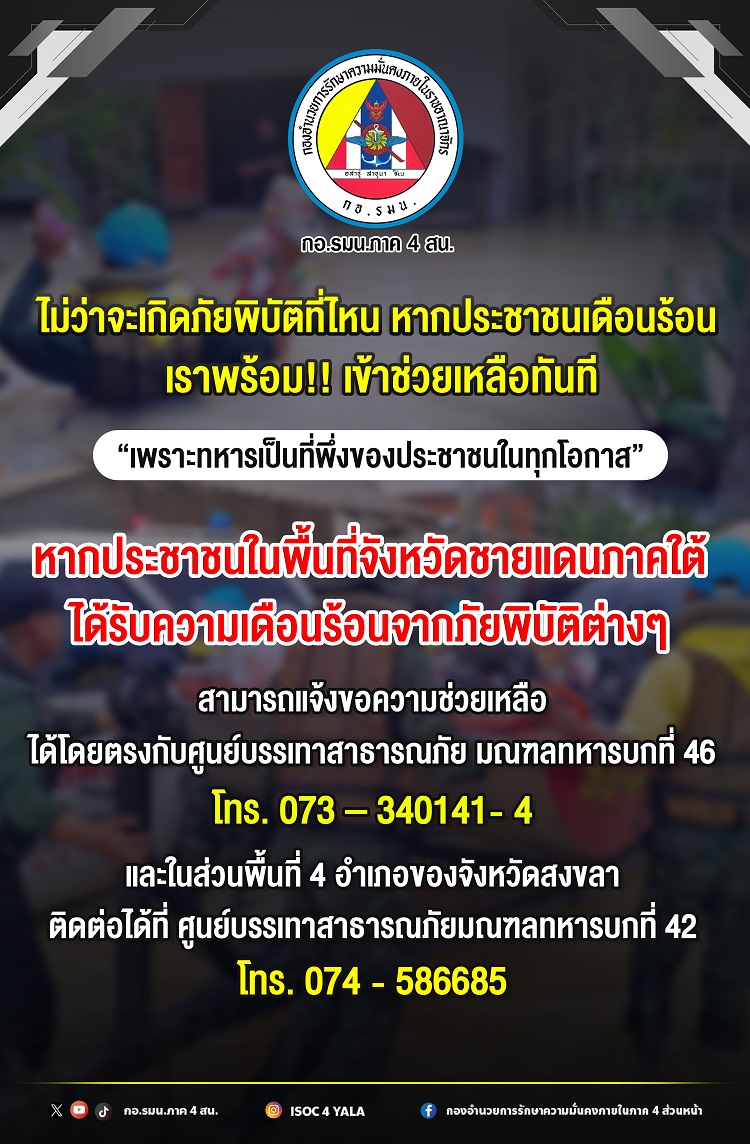 แจ้งเตือน พี่น้องประชาชนในพื้นที่จังหวัดชายแดนภาคใต้ เนื่องด้วยช่วงนี้เข้าสู่ช่วงหน้าฝน ซึ่งจากเหตุการณ์ในทุก ๆ ปี หลายพื้นที่เกิดน้ำท่วมฉับพลันและน้ำป่าไหลหลาก ดังนั้น กองอำนวยการรักษาความมั่นคงภายในภาค 4 ส่วนหน้า ได้นำเบอร์โทรศัพท์ของศูนย์บรรเทาสาธารณภัยในพื้นที่จังหวัดชายแดนภาคใต้ มาให้พี่น้องประชาชนเก็บไว้เป็นข้อมูล เผื่อพบเจอเหตุการณ์ต่าง ๆ ก็สามารถที่จะแจ้งขอความช่วยเหลือได้โดยตรงกับหน่วยทหารในพื้นที่ได้ โดยมีหน่วยรับผิดชอบและเบอร์โทรศัพท์ติดต่อ ดังนี้