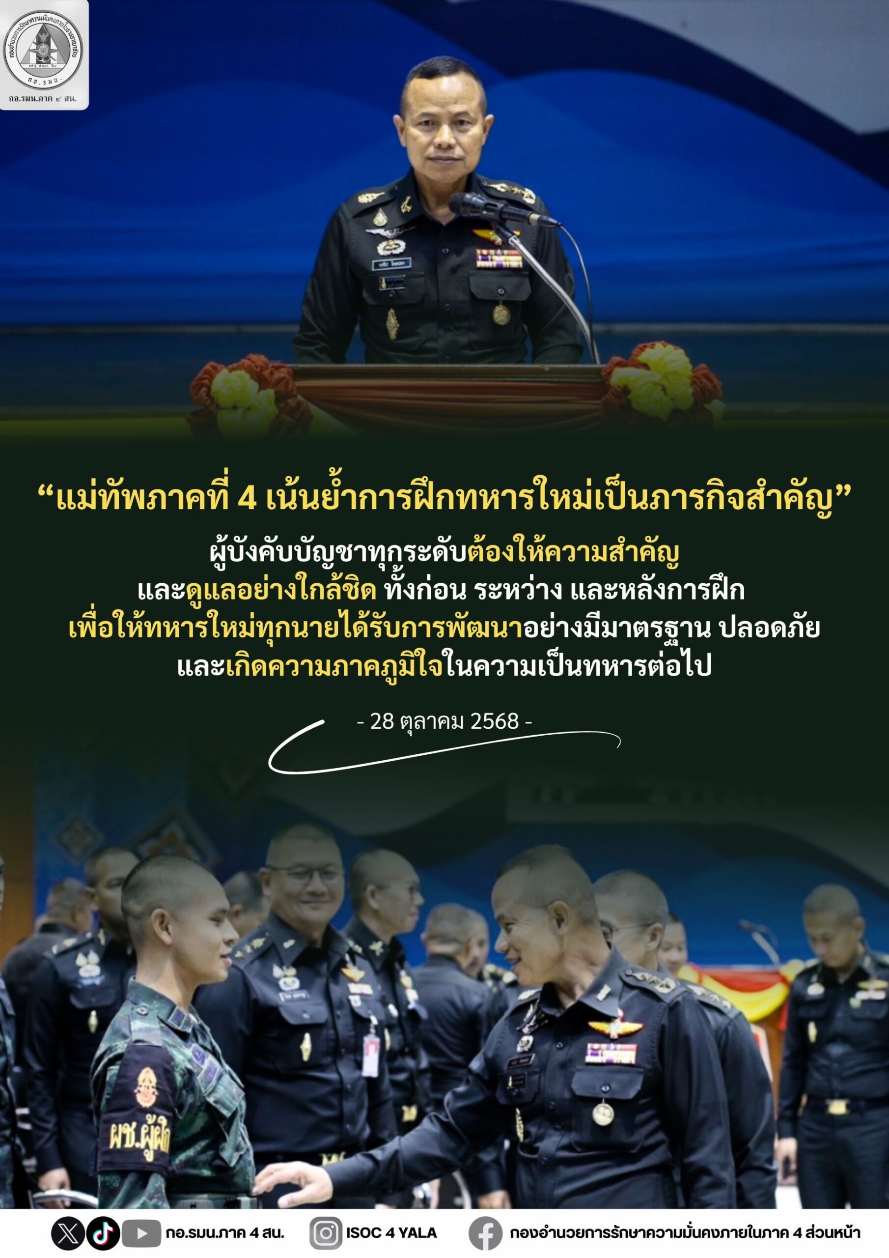28 ตุลาคม 2568 แม่ทัพภาคที่ 4 มอบนโยบายการฝึกทหารใหม่ ผลัดที่ 2/2568 ย้ำความปลอดภัยและคุณภาพชีวิตสูงสุด