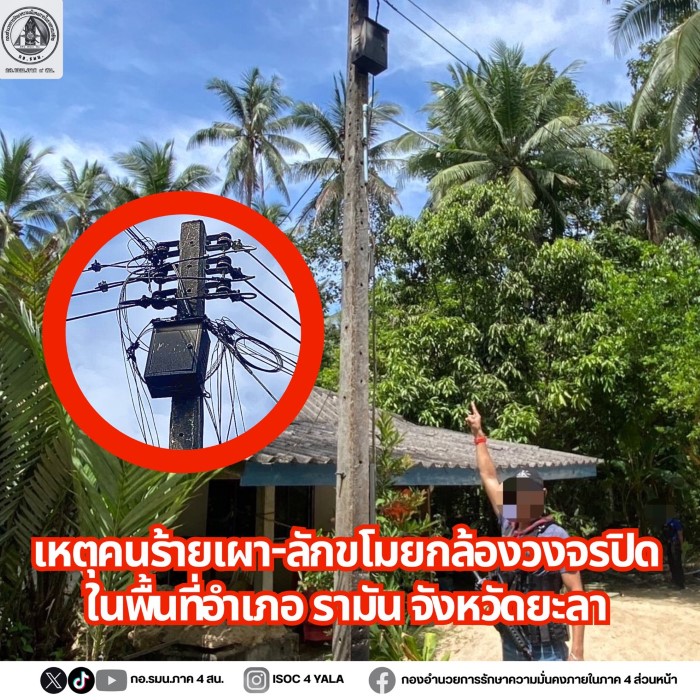 - At the Ban Cak Guwah three-way intersection, Village No. 1, Cak Guwah Subdistrict, Raman District, Yala Province — one CCTV set (comprising two cameras) was found burned, and one additional camera was stolen.