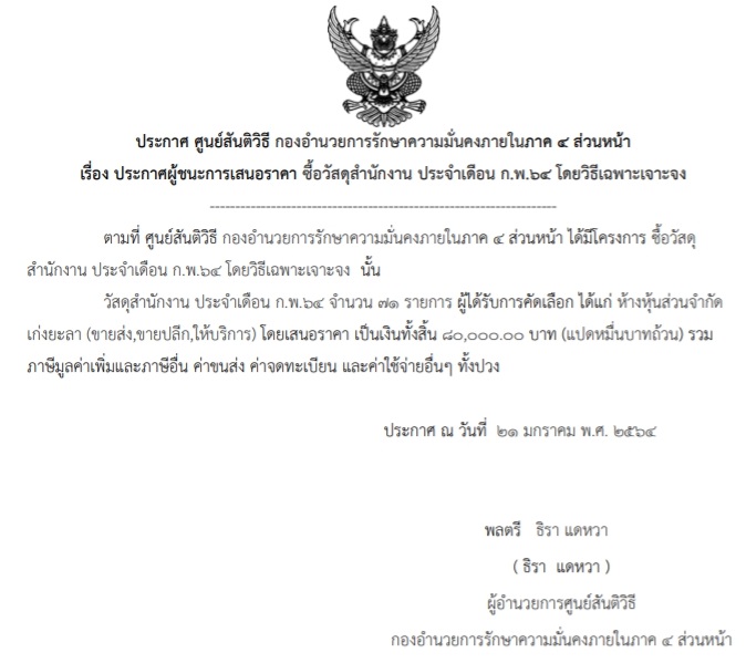 จัดซื้อ จัดจ้างประกาศผู้ชนะการเสนอราคา ประกาศผู้ชนะการเสนอราคา ซื้อวัสดุสำนักงาน ประจำเดือน ก.พ.64 โดยวิธีเฉพาะเจาะจง ( 80,000.00 บาท ) January 29, 2021 871 Share Facebook Twitter Google+ Telegram LINE ศสว.กอ.รมน.ภาค 4 สน.