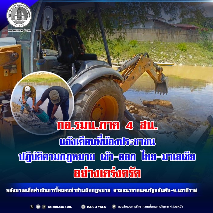 “ISOC Wilayah 4 Depan ingatkan orang ramai supaya ikut undang-undang bila keluar masuk sempadan Thai–Malaysia dengan ketat, selepas pihak berkuasa Malaysia ambil tindakan robohkan pelabuhan haram di sempadan Negeri Kelantan dan Wilayah Narathiwat.”