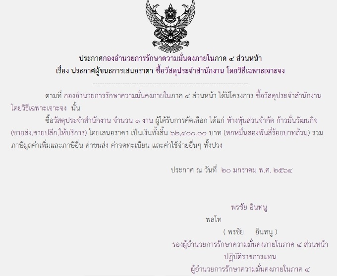 จัดซื้อ จัดจ้างประกาศผู้ชนะการเสนอราคา ประกาศผู้ชนะการเสนอราคา ซื้อวัสดุประจำสำนักงาน โดยวิธีเฉพาะเจาะจง ( 62,400.00 บาท ) January 29, 2021 653 Share Facebook Twitter Google+ Telegram LINE สกบ.กอ.รมน.ภาค 4 สน.