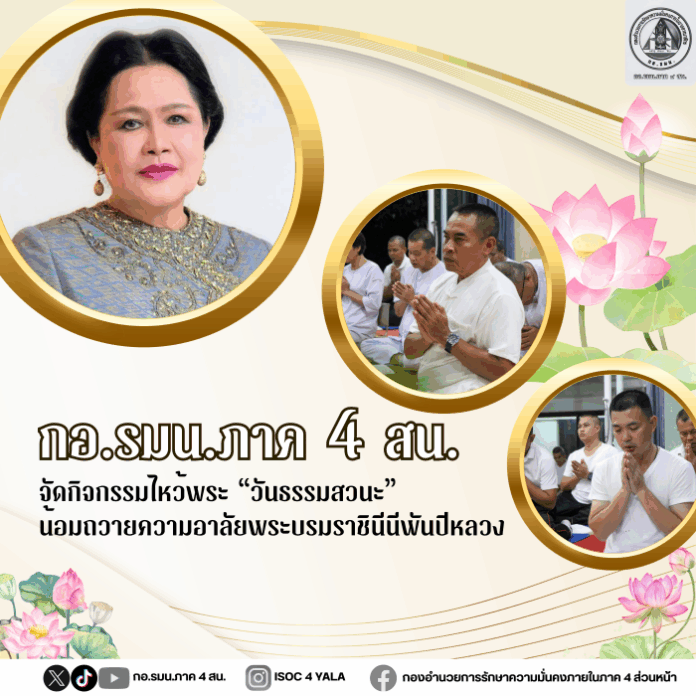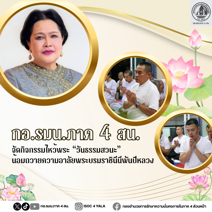 วันที่ 29 ตุลาคม 2568 เวลา 19.00 น. ที่ลานปฏิบัติธรรมเขาพระศรีศากยมุณีพุทธโคดม ภายในค่ายสิรินธร ตำบลเขาตูม อำเภอยะรัง จังหวัดปัตตานี พลตรี เฉลิมพงค์ คงบัว เลขาธิการกองอำนวยการรักษาความมั่นคงภายในภาค 4 ส่วนหน้า เป็นประธานในกิจกรรมไหว้พระ สวดมนต์ ทำวัตรเย็น และเจริญจิตภาวนา เนื่องในวันธรรมสวนะ ประจำเดือนตุลาคม 2568 พร้อมถวายความอาลัยและน้อมสำนึกในพระมหากรุณาธิคุณของ สมเด็จพระนางเจ้าสิริกิติ์ พระบรมราชินีนาถ พระบรมราชชนนีพันปีหลวง เพื่อให้กำลังพลได้ปฏิบัติตนตามแบบพุทธศาสนิกชนที่ดีด้านการสวดมนต์ไหว้พระ รักษาศีลในวันธรรมสวนะ เห็นคุณค่าของหลักธรรมคำสั่งสอนของพระพุทธเจ้า และนำหลักธรรมปรับใช้ในชีวิตประจำวันได้อย่างถูกต้องและเหมาะสม โดยมีกำลังพล และครอบครัว เข้าร่วมกิจกรรมอย่างพร้อมเพรียง