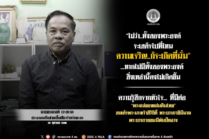 ประชาสัมพันธ์ข่าวประชาสัมพันธ์ “ไม่ว่า..ทั้งสองพระองค์ จะเสด็จไปที่ไหน ความเจริญ..ก็จะเกิดที่นั่น … หากไม่มีทั้งสองพระองค์ สิ่งเหล่านี้คงไม่เกิดขึ้น” October 30, 2025 78 Share Facebook Twitter Google+ Telegram LINE ความรู้สึกจากหัวใจ… ที่มีต่อ “พระแม่ของแผ่นดินไทย” สมเด็จพระนางเจ้าสิริกิติ์ พระบรมราชินีนาถ พระบรมราชชนนีพันปีหลวง …………… นายชานนท์ เจะหะมะ ประธานเครือข่ายเสื้อเขียวจังหวัดยะลา 28 ตุลาคม 2568 แม่ทัพภาคที่4 กองอำนวยการรักษาความมั่นคงภายในภาค4ส่วนหน้า
